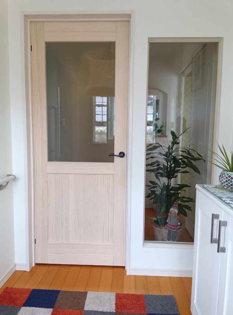 壁には建具とクリアのデザイン窓をいれました。クリアにした理由は、玄関側から見た時に壁で圧迫感が出ないようにするのとお気に入りのニッチが見える状態にしたいと要望があった為です。
