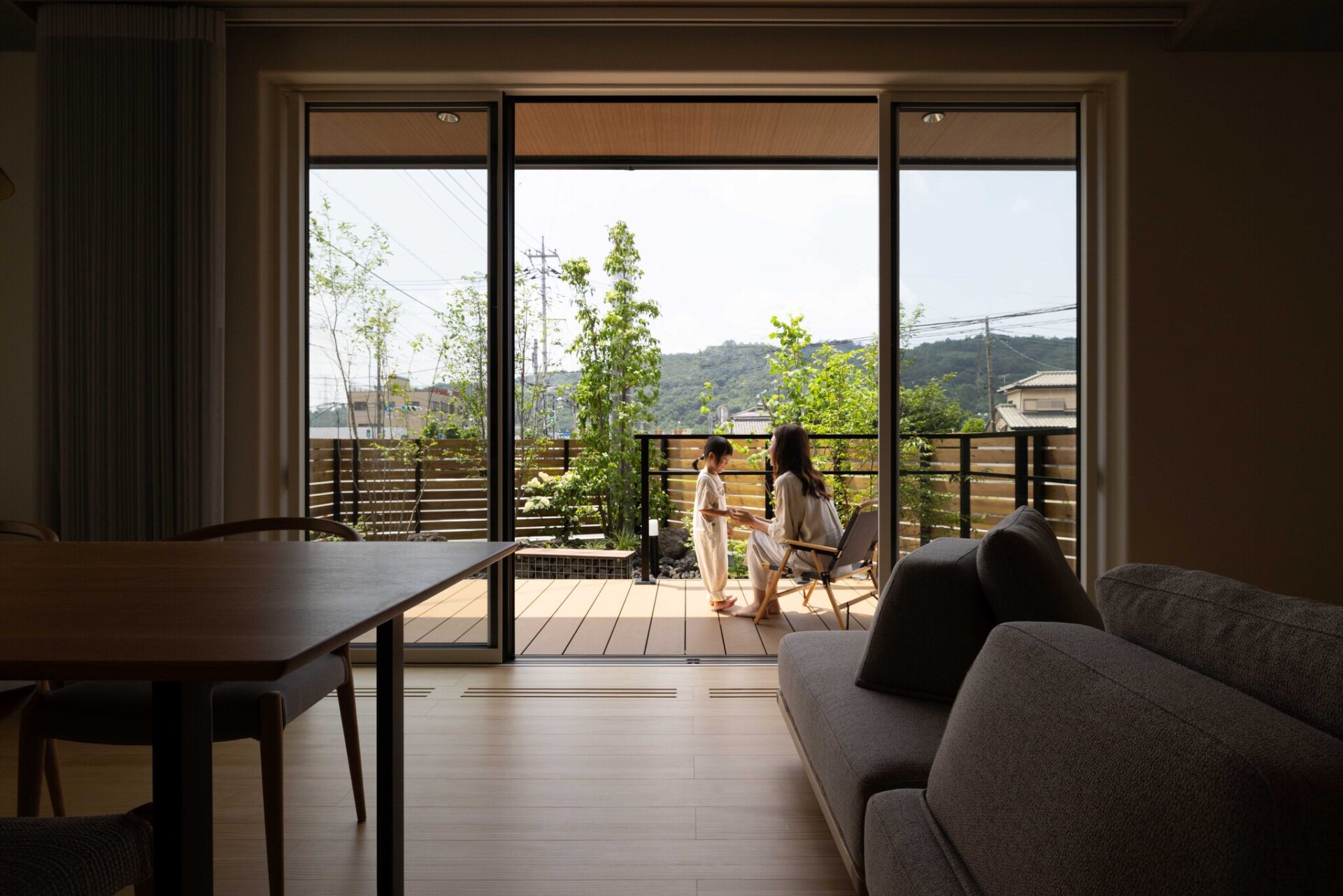 キッチンから家中を見渡せる「センター設計」と、リビングからウッドデッキへフラットに続く「大開口」が特徴。料理中も家族との団らんが弾み、週末には光と風を感じながらティータイムを楽しめる、内と外が心地よくつながる設計です。 - 細部まで美しい「ノイズレス・デザイン」