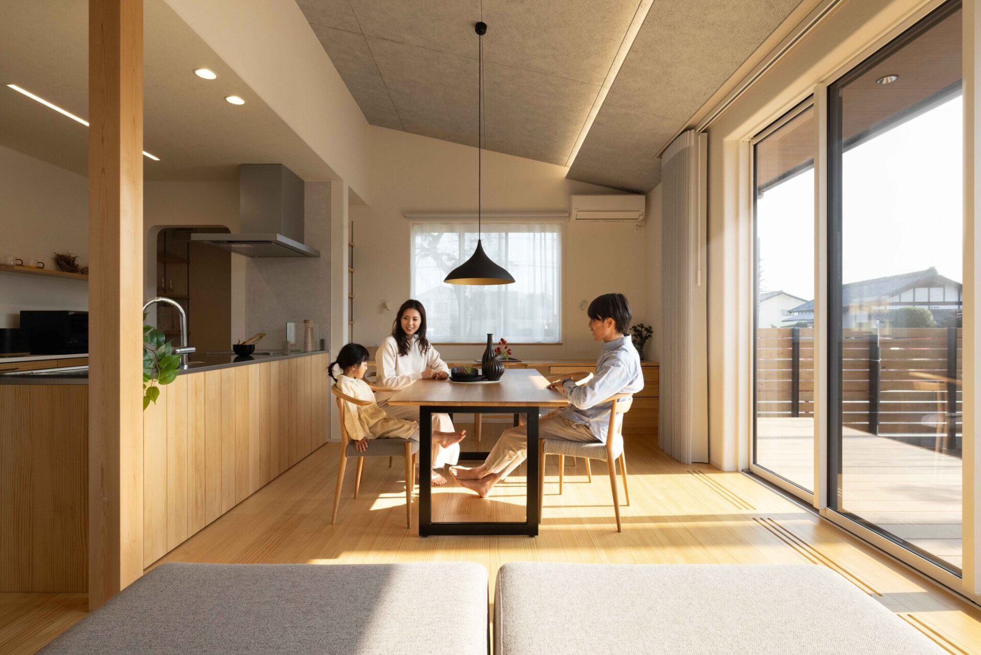 スタイリッシュな木毛セメント板の天井材と木の温もりが溶け合う、北欧モダンのようなLDK。勾配天井がもたらす光とゆとりが、無機質×自然素材の異素材の組み合わせをより一層引き立てます。 - 家族の笑顔と光が広がる、開放感あふれるLDK