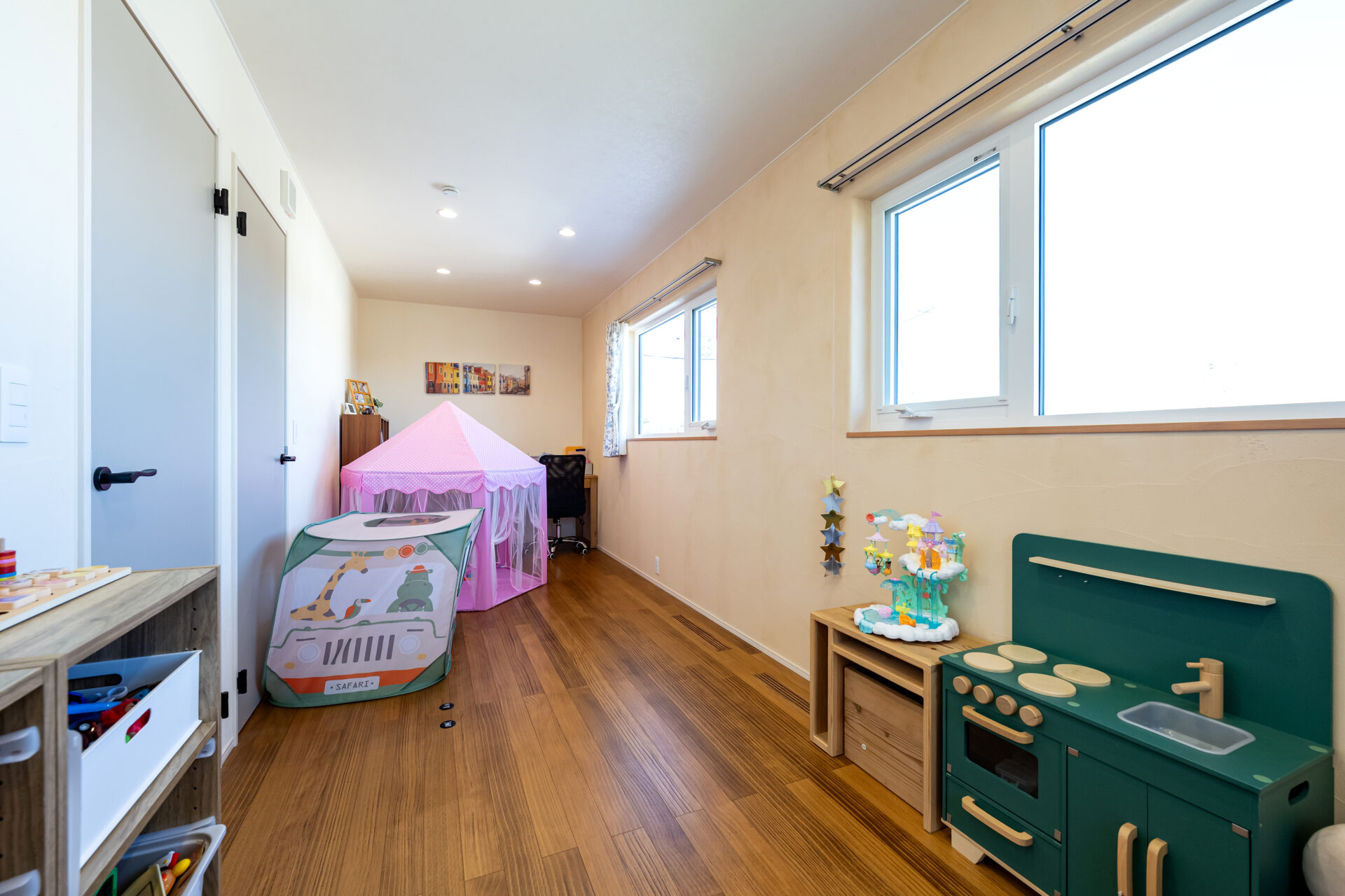子供部屋はお子さんが小さいため広々活用できるようあえて仕切りはつけず、
